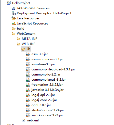 (1)、新建一个动态Web项目HelloProject,将Struts2所需要的基本jar包导入项目的lib文件夹下,如下图: