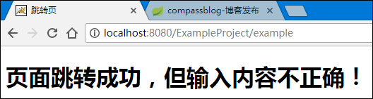 <%@ page language="java" contentType="text/html; charset=UTF-8" pageEncoding="UTF-8"%><!DOCTYPE html PUBLIC "-//W3C//DTD HTML 4.01 Transitional//EN" "http://www.w3.org/TR/html4/loose.dtd"><html><head><meta http-equiv="Content-Type" content="text/html; charset=UTF-8"><title>跳转页</title></head><body> <h1>页面跳转成功,但输入内容不正确!</h1></body></html>
