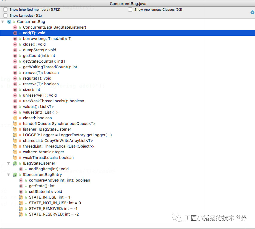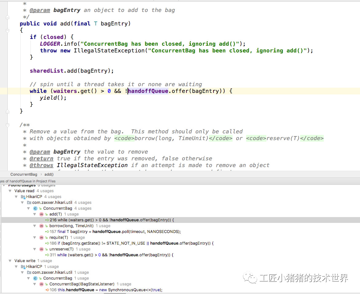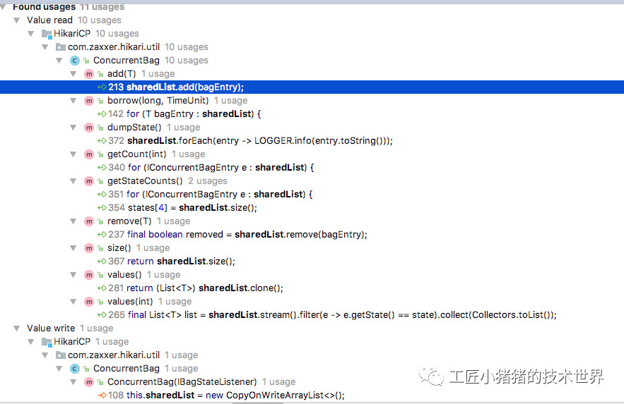 上节提过,CopyOnWriteArrayList负责存放ConcurrentBag中全部用于出借的资源,就是private final CopyOnWriteArrayList sharedList; 如下图所示,sharedList中的资源通过add方法添加,remove方法出借
