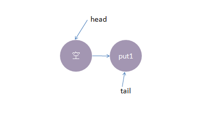 1、线程put1执行 put(1)操作,由于当前没有配对的消费线程,所以put1线程入队列,自旋一小会后睡眠等待,这时队列状态如下: