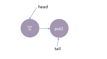 2、接着,线程put2执行了put(2)操作,跟前面一样,put2线程入队列,自旋一小会后睡眠等待,这时队列状态如下: