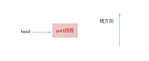1、线程put1执行 put(1)操作,由于当前没有配对的消费线程,所以put1线程入栈,自旋一小会后睡眠等待,这时栈状态如下: