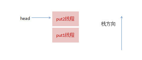 2、接着,线程put2再次执行了put(2)操作,跟前面一样,put2线程入栈,自旋一小会后睡眠等待,这时栈状态如下: