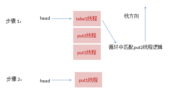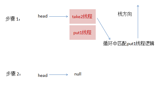 3、这时候,来了一个线程take1,执行了take操作,这时候发现栈顶为put2线程,匹配成功,但是实现会先把take1线程入栈,然后take1线程循环执行匹配put2线程逻辑,一旦发现没有并发冲突,就会把栈顶指针直接指向 put1线程