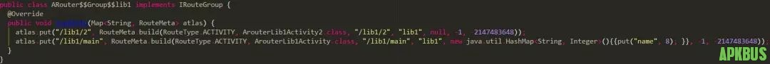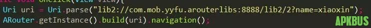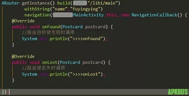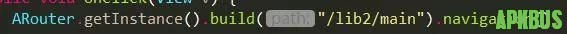 以上ARouter初始化完成,ARouter主要做的工作就是把ARouter相关的反射类加载到Warehouse中,在路由跳转中从Warehouse取的对应路由下的界面并进行跳转。同时找出拦截实现类,调用路由跳转时用于拦截。3.执行路由跳转在代码中使用下图所示进行简单路由跳转。通过传入想要跳转的目的路由/lib2/main到bulid中,获取Postcard,通过调用获取的Postcard调用navigation进行路由跳转。