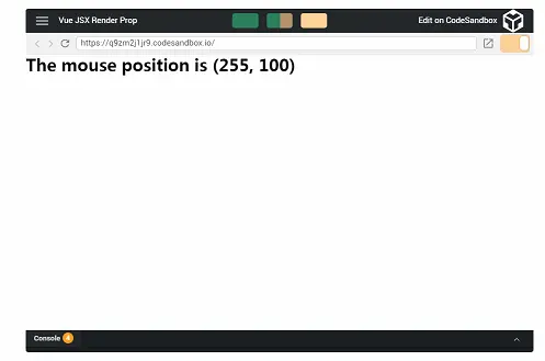 在我们父组件app.vue,鼠标的组件将由我们的子组件组成。在Mouse.js我们会通知renderprop函数回调渲染方法。你不能在模板用JSX,所以在SFC’s的方法部分混合了JSX。这个是我们的鼠标组件: