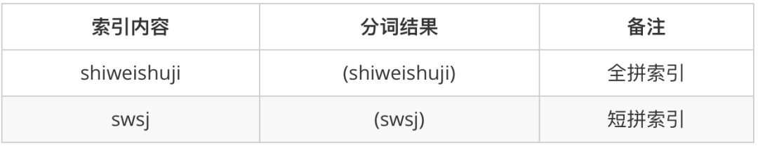 在FTS5匹配以上Query时,用户1、2两种输入都作为"shiweishuji"的前缀被匹配,而3的输入会作为“swsj”的前缀被匹配。 索引方案二
