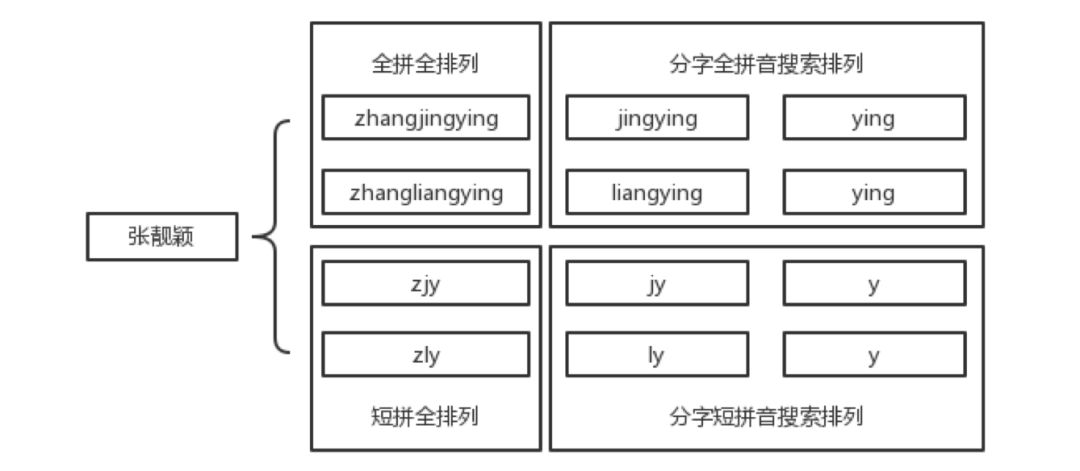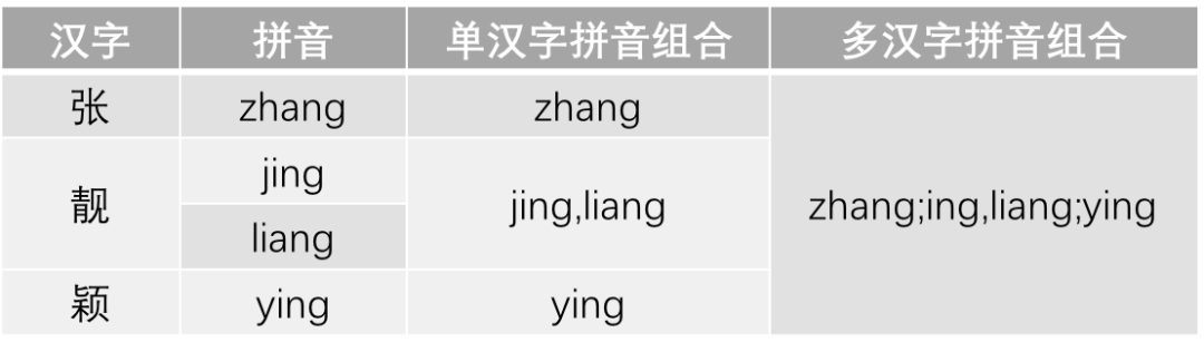 方案一和方案二是在不考虑多音字的情况的索引方案,当引入了多音字以后,在组合拼音字符串时,每一个拼音都可能存在多种情况,以下为用户备注“张靓颖”的索引。