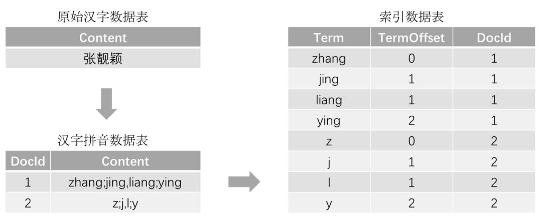 所以,需要建立索引时,需要把每个汉字的拼音作为前缀建立到索引中,如下表: