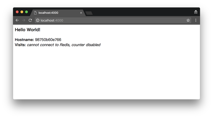 <h3>Hello World!</h3><b>Hostname:</b> 98750b60e766<br/><b>Visits:</b> <i>cannot connect to Redis, counter disabled</i>