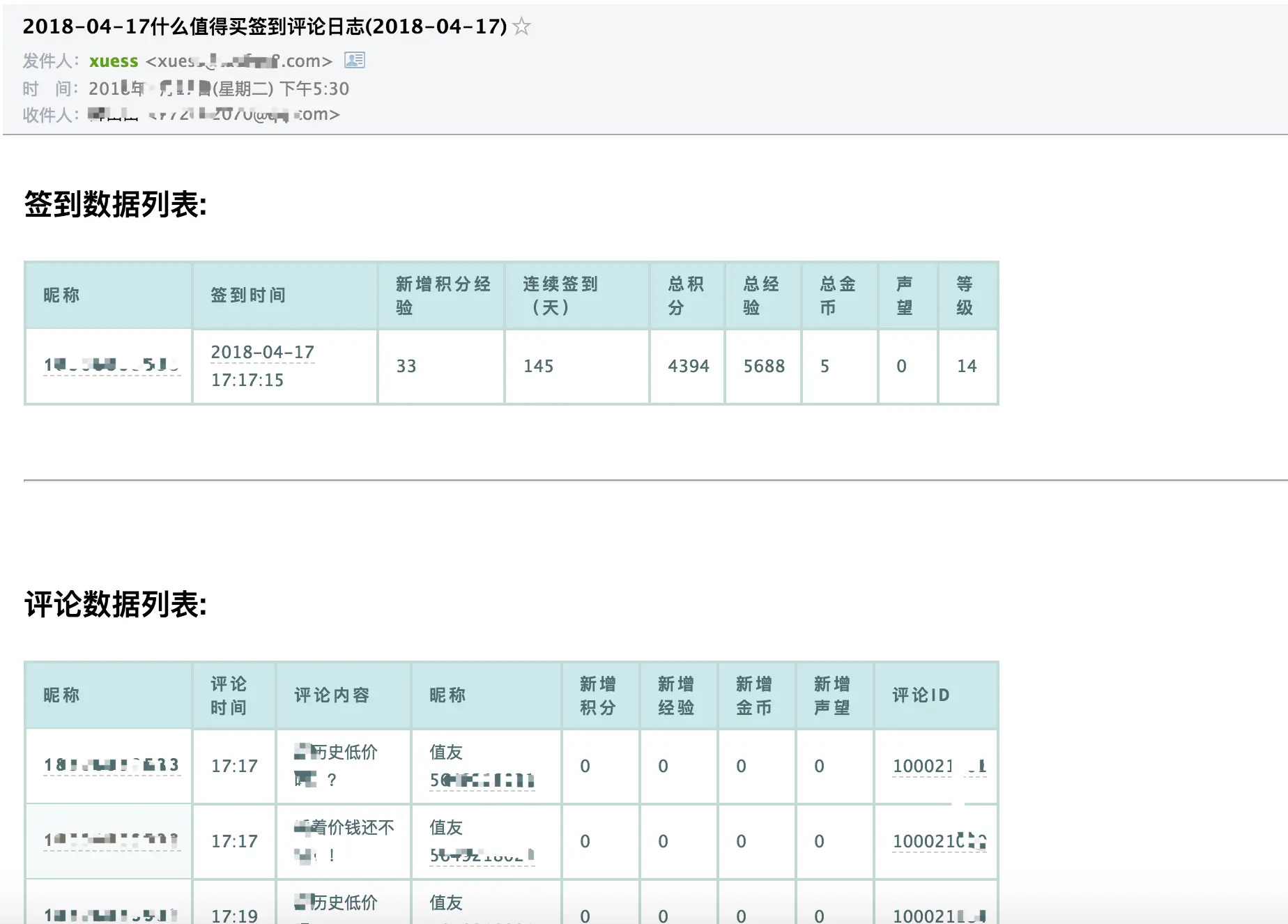 6:10执行签到和评论功能,17:30执行签到结果邮件发送功能,执行间隔为随机时间,可自行修改。由于值得买,每天前三条,发送评论有