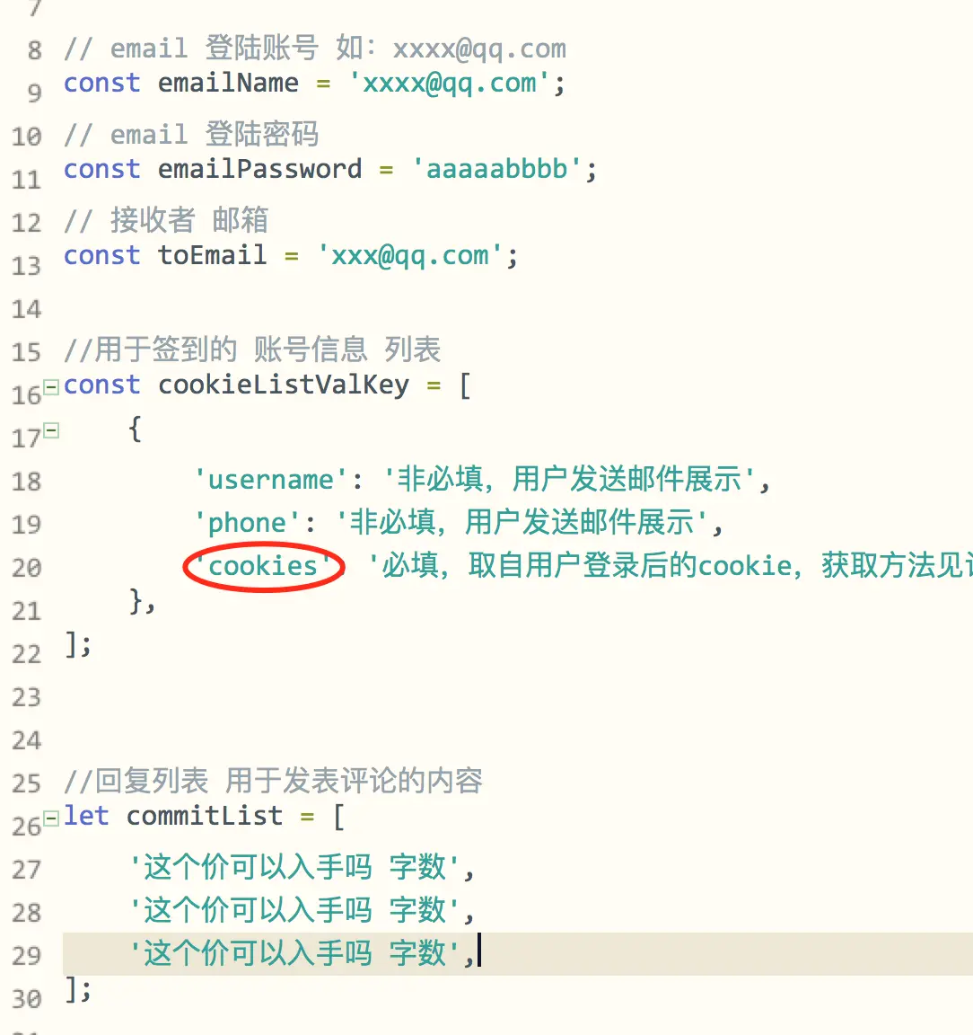 'cookies': '必填,取自用户登录后的cookie,获取方法见说明文档'
