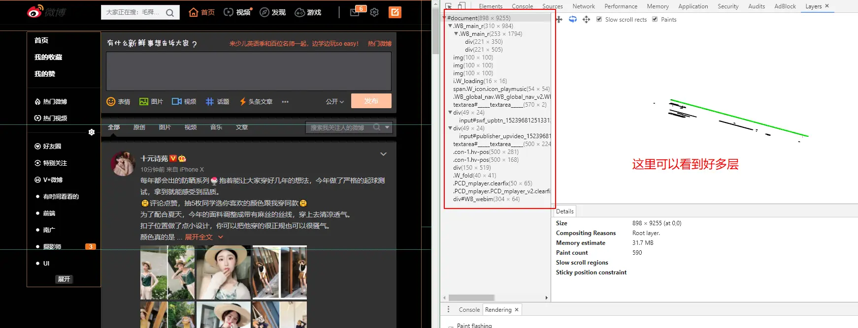 在上图中黄色边框表示放到了一个新的复合层(composited layer)中渲染,左侧的列表里列出页面里存在哪些渲染层,右侧的 Details 显示的是这些渲染层的详细信息,包括渲染层的大小、形成原因等。