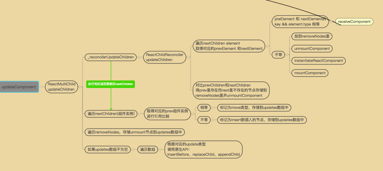 观察 ReactCompositeComponent 和 ReactDOMComponent 的更新流程, 我们发现 React 每次走到一个组件更新过程的最后部分, 都会有一个判断 : 如果 nextELement 和 prevElement key 和 type 相等, 就会调用receiveComponent. receiveComponent和updateComponent一样, 每种组件都有一个, 作用就相当于updateComponent 接受了新 props 的版本. 而这里调用的就是子元素的receiveComponent, 进而进行子元素的更新, 于是就形成了递归更新、递归diff. 因此, 整个流程就像这样(矢量图) :