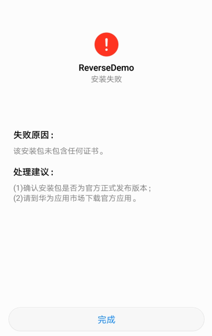 很明显能看出安装失败的原因是没有证书,我特意展示这一步就是为了说明我们打包时的证书其实是有用的,就算别人能拿到我们的apk,没有签名证书,它也做不了什么。