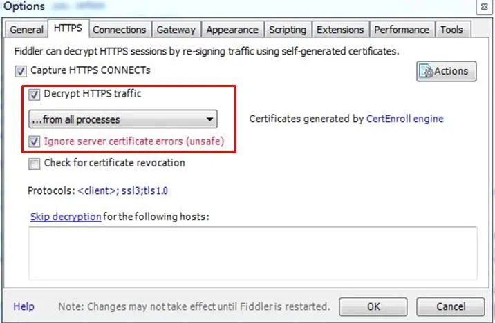 HTTPS信息包 操作很简单,打开下载好的fiddler,找到Tools -> Options,然后再HTTPS的工具栏下勾选Decrpt HTTPS traffic,在新弹出的选项栏下勾选Ignore server certificate errors。