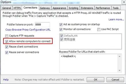 HTTP/HTTPS到fiddler相同的,在Connections选项栏下勾选Allow remote computers to connect,并记住上面的端口号8888,后面会使用到。