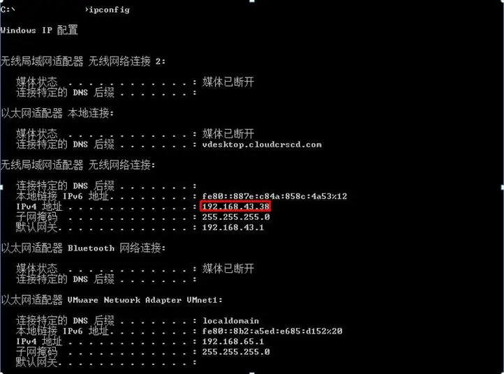 假如你已经让电脑和手机处于同一个网络下了,这时候我们需要知道此网络的ip地址,可以在命令行输入ipconfig简单的获得,如图。