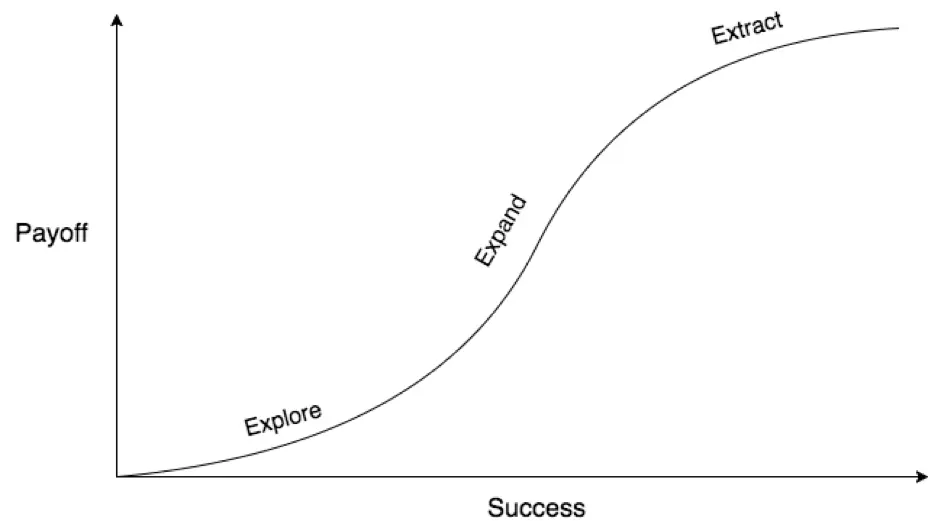 - 探索(Explore),此时的产品开发仍处于非常初期的阶段,仍然需要花费大量时间寻找产品和市场的适配点,也是收益最低的阶段。
