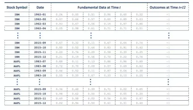 在上数据表中,每一行表示公司演变历史序列中的一个时间点,输入数据和目标输出数据相对应,以便于对模型进行训练。通过机器学习,将一份很难读懂的公司财务报表,翻译成股票在未来一年中收益率在 +1 类别中的概率(优于表现中值的股票)。这种简单易懂的解读,虽然对机器学习来说是个小目标,但对投资者的投资决定却是一个很大的帮助。另外,投资者还可以用这种解读为起点,继续建立其他更精细的投资组合。