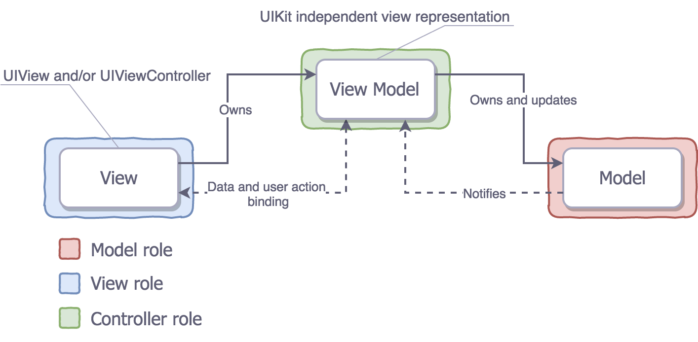 MVVM可以看做是Model-View-ViewModel,但是我们这里所构建的看做Model-View-ViewController-ViewMode更合适。由于view和controller如此紧密的被viewController联系在一起,我们把viewController也当做“view”。