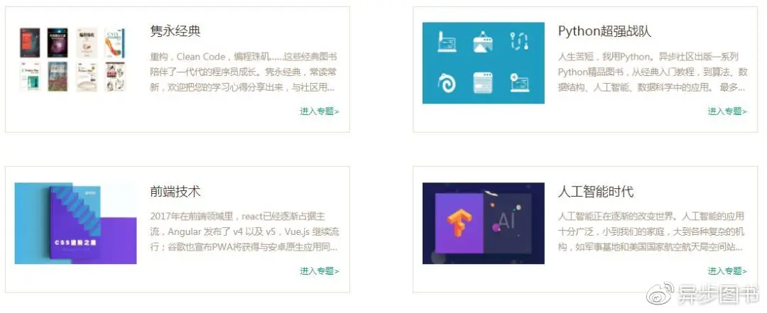 专题页面方便了对某一技术方向感兴趣的同学集中浏览相关信息,包括图书、文章、书评和视频课等。技术方向会包括热点领域如人工智能,以及异步社区比较有特色的方向,比如我们的经典图书。