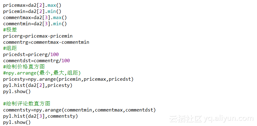 其中,借助arrange()方法来制定样式,arrange()方法第一个参数代表最小值,第二个参数代表最大值,第三个参数代表组距,接下来使用hist()方法来绘制直方图。