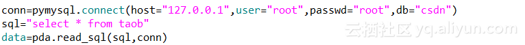 那么接下来如何将这些数据导入进来?首先通过pymysql连接数据库(如果出现乱码,则对pymysql的源码进行修改),连接成功后,将taob中的数据全部检索出来,然后借助pandas中的read_sql()方法便可以将数据导入到内存中。read_sql()方法有两个参数,第一个参数是sql语句,第二个参数是MySQL数据库的连接信息。具体代码如下图: