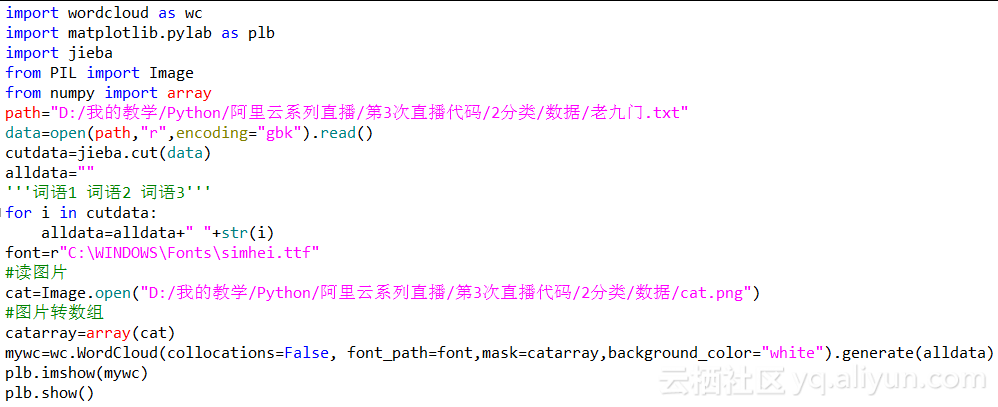 实现的大致流程是:先使用cut()对文档进行切词,在切词完成之后,将这些词语整理为固定格式,然后根据所需的词云图的展现形式读取相应的图片(下图中的词云图是猫的形状),接着使用wc.WordCloud()进行词云图的转换,最后通过imshow()展现出相应的词云图。例如根据老九门.txt文档绘制的词云图效果如下图所示: