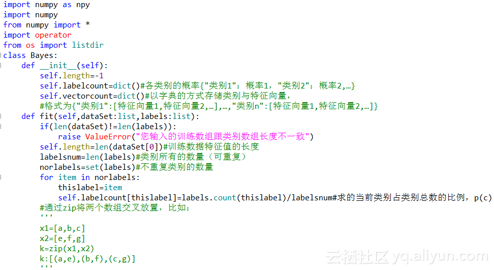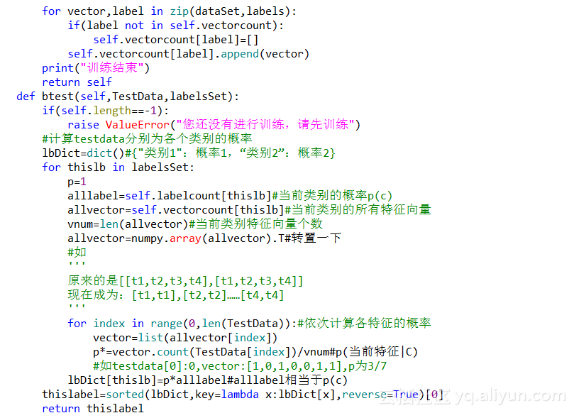 跟KNN算法一样,贝叶斯算法也有两种实现方式,一种是详细的实现: