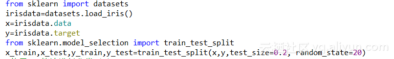 还有一种加载方法是借助sklearn来实现加载。sklearn的datasets中自带有鸢尾花的数据集,通过使用datasets的load_iris()方法就可以将数据加载出来,随后同样获取特征和类别,然后进行训练数据和测试数据的分离(一般做交叉验证),具体是使用train_test_split()方法进行分离,该方法第三个参数代表测试比例,第四个参数是随机种子,具体操作如下: