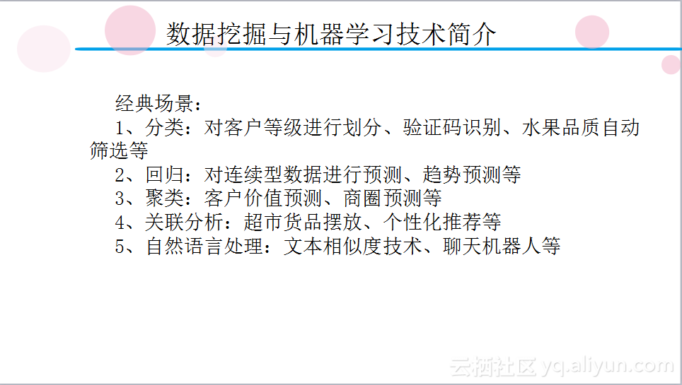 由于机器学习技术和数据挖掘技术都是对数据之间的规律进行探索,所以人们通常将两者放在一起提及。而这两种技术在现实生活中也有着非常广阔的应用场景,其中经典的几类应用场景如下图所示:
