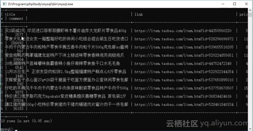 可以看到,taob表中有四个字段。其中title字段用于存储淘宝商品的名称;link字段存储淘宝商品的链接;price存储淘宝商品的价格;comment存储淘宝商品的评论数(一定程度上代表商品的销量)。