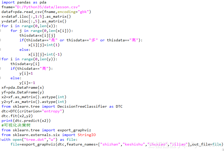 决策树算法实现过程为:首先取出数据的类别,然后对数据转化描述的方式(例如将“是”转化成1,“否”转化成0),借助于sklearn中的DecisionTreeClassifier建立决策树,使用fit()方法进行数据训练,训练完成后直接使用predict()即可得到预测结果,最后使用export_graphviz进行决策树的可视化。具体实现过程如下图所示: