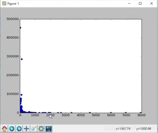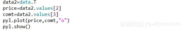 首先需要从数据中抽出价格数据和评论数据。通常的做法可以借助循环去抽取,但是这种方法太复杂,有一种简单的方法是这个数据框进行转置,这时候原先的列数据就变成了现在的行数据,可以很方便的获取价格数据和评论数据。接下来通过plot()方法绘制散点图,plot()方法第一个参数代表横坐标,第二个参数代表纵坐标,第三个参数代表图的类型,”o”代表散点图。最后通过show()方法将其展现出来,这样就可以直观的观测到离群点。这些离群点对数据的分析没有帮助,在实际操作中往往需要将这些离群点代表的数据删除或者转成正常的值。下图是绘制的散点图: