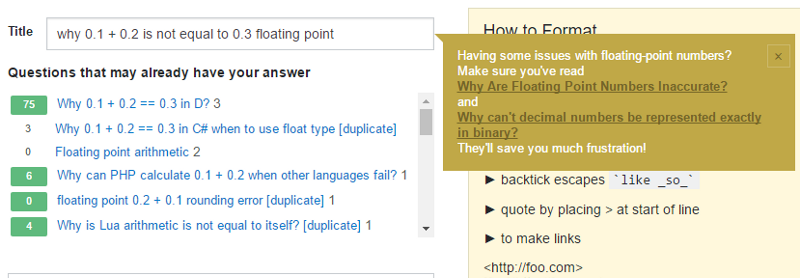 另外一个不熟悉Javascript的人会经常提的问题是0.1加0.2等于0.30000000000000004, 这意味着0.1加0.2不等于0.3。stackoverflow上面有许多这个现象的问题: