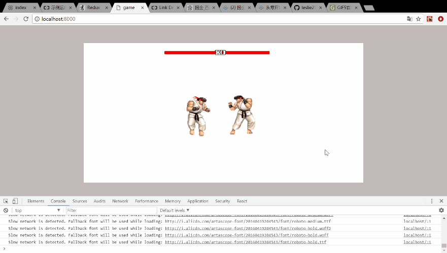 首先我们先实现不攻击,当人物前进撞到敌人时,让敌人被自己推着移动。这里就需要用到DIV的碰撞检测了。目前这个游戏很简单,所以我就只考虑了水平的碰撞,忽略了垂直碰撞,这两者之间其实原理是一样的。我是用offsetLeft属性检测碰撞的。当我们按D前进时,在keydown中监听人物之间的距离,当this.refs.player2.offsetLeft - this.refs.player1.offsetLeft小于等于player1人物图片的宽度时,就认为两个人物之间碰撞了。当检测到碰撞后,给player2人物加上后退行动,这样碰撞后每次player1人物前进的时候,player2人物就会后退。