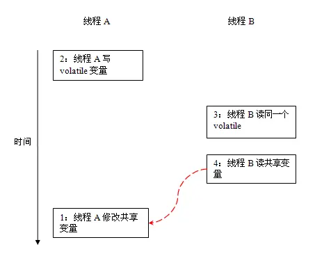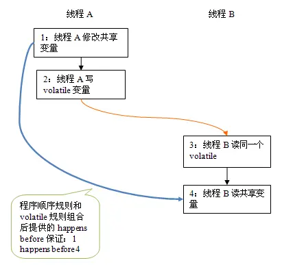 这里A线程写一个volatile变量后,B线程读同一个volatile变量。A线程在写volatile变量之前所有可见的共享变量,在B线程读同一个volatile变量后,将立即变得对B线程可见。