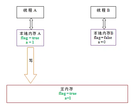 如上图所示,线程A在写flag变量后,本地内存A中被线程A更新过的两个共享变量的值被刷新到主内存中。此时,本地内存A和主内存中的共享变量的值是一致的。