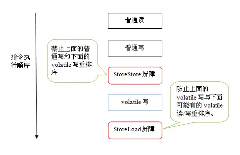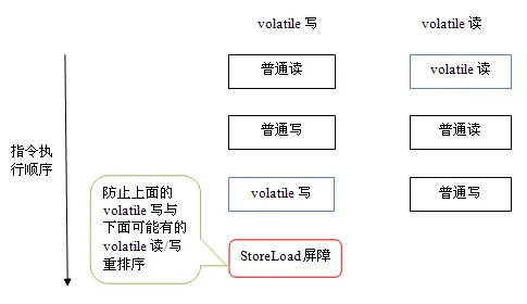 上图中的LoadLoad屏障用来禁止处理器把上面的volatile读与下面的普通读重排序。LoadStore屏障用来禁止处理器把上面的volatile读与下面的普通写重排序。