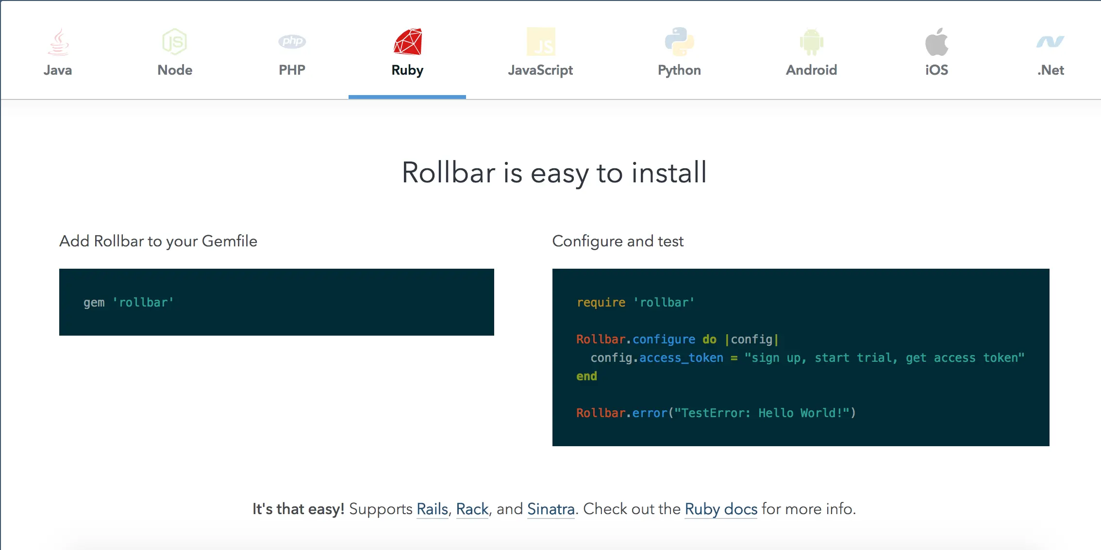 Rollbar作为一个第三方的监控服务,对大多数语言都提供了支持,我们只需要简单安装对应语言的SDK并且附上简单的配置就可以轻松对接这一服务。具体我们可以通过查看Rollbar服务SDK来查阅Rollbar对语言的支持情况以及相关的配置。下面是Ruby语言对Rollbar的使用