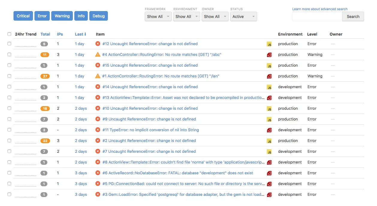 而Rails项目在Rollbar里面监控起来大概是这样子,能够区分前端跟后端的错误信息,并且提供搜索功能。