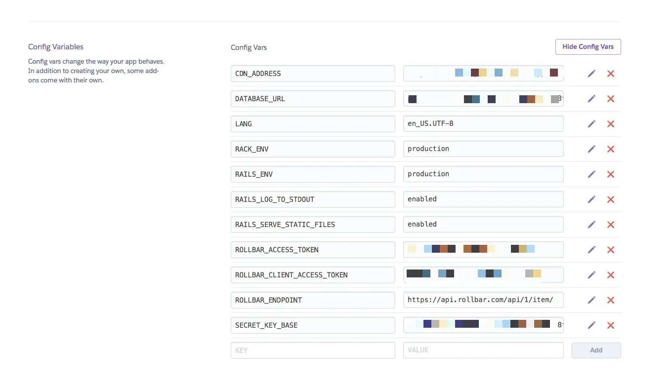 缺点: 实现起来稍微有点费劲,特别是每次部署都要用不同的ROLLBAR_JS_CODE_VERSION的时候。如果是常规项目还好,我们可以在部署的时候获取代码仓库的Git SHA来自动设置ROLLBAR_JS_CODE_VERSION环境变量,并且存到.env文件中,让Rake任务与运行环境可以共享同一个ROLLBAR_JS_CODE_VERSION,还能保证每次部署都使用不同的ROLLBAR_JS_CODE_VERSION。但是在Heroku中的项目就不那么容易了,我们的环境变量都都需要在网站或者命令行中去设置,而在部署脚本不归自己管的情况下要使这个行为自动化并不那么容易。