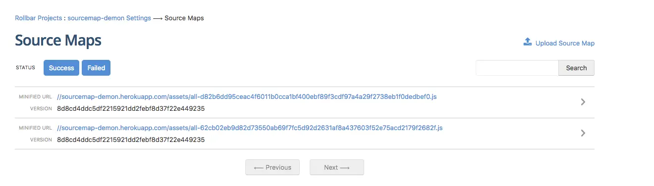 需要注意这里的code_version字段与调用上传api时候的version字段要一一对应,这样当代码报错的时候rollbar.js才能找到对应版本。已经上传的Source Map文件列表可以在Rollbar的Source Map设置页面中查看,大概如下