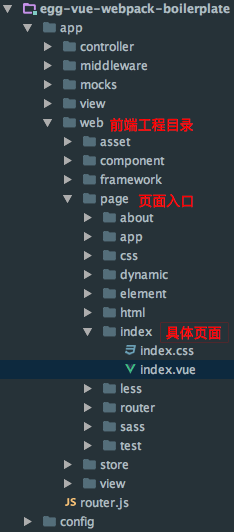 - 该项目中,app/web/page 目录中所有 .vue 文件当作 Webpack 构建入口是采用 app/web/framework/vue/entry 的 client-loader.js 和 server-loader.js 模板实现的,这个需要结合 webpack.config.js 下的 entry.loader 使用。