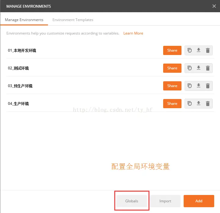 四.配置全局环境变量 与配置局部变量相同,入口也在右上角, 全局变量在任何一个环境下都能生效,比如我配置的【01,02,03,04】四个环境,配置的全局变量都有效,不会因为切换环境了而失效。