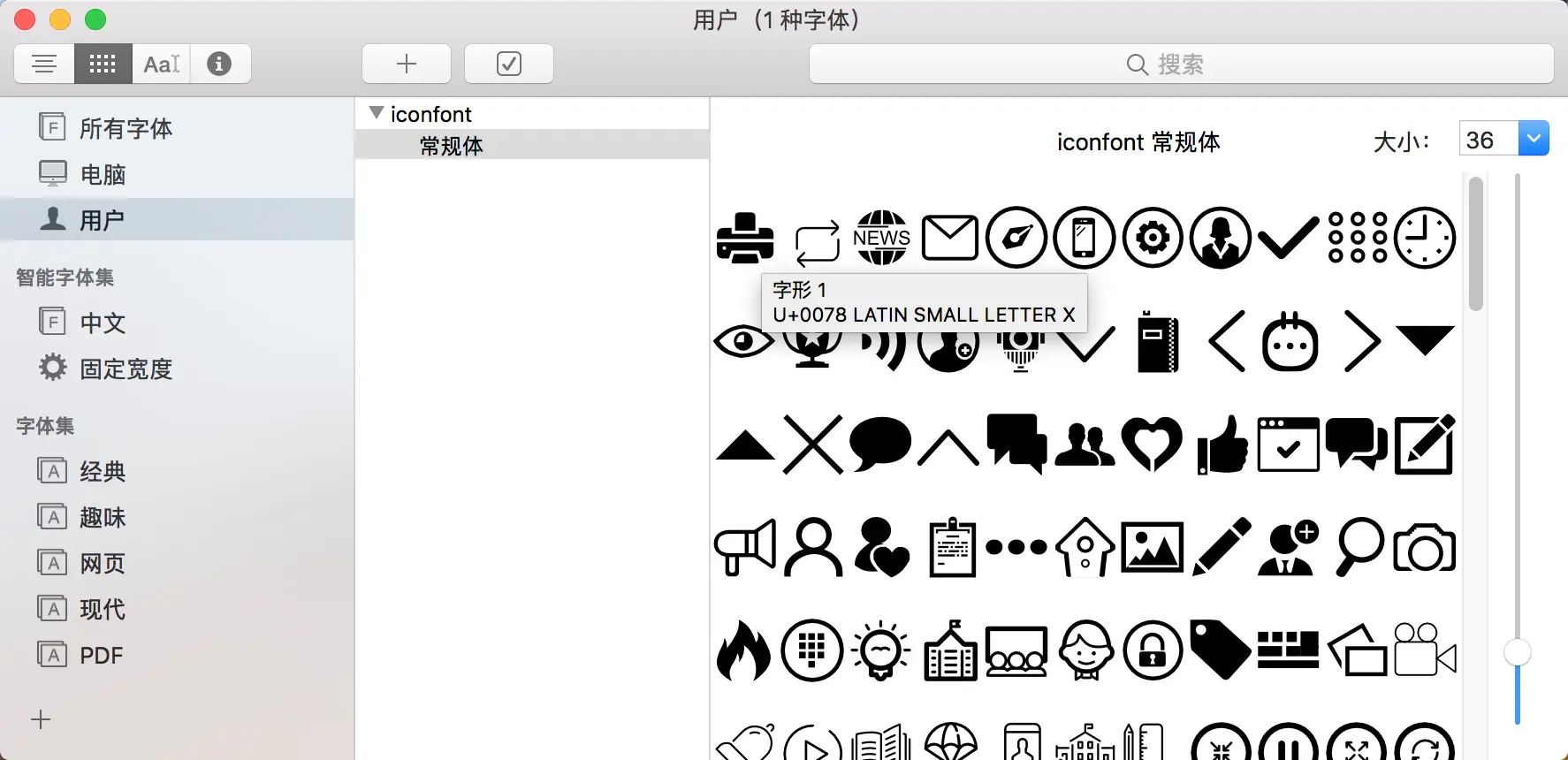 如中可以看到该图标的编码为:U+0078。