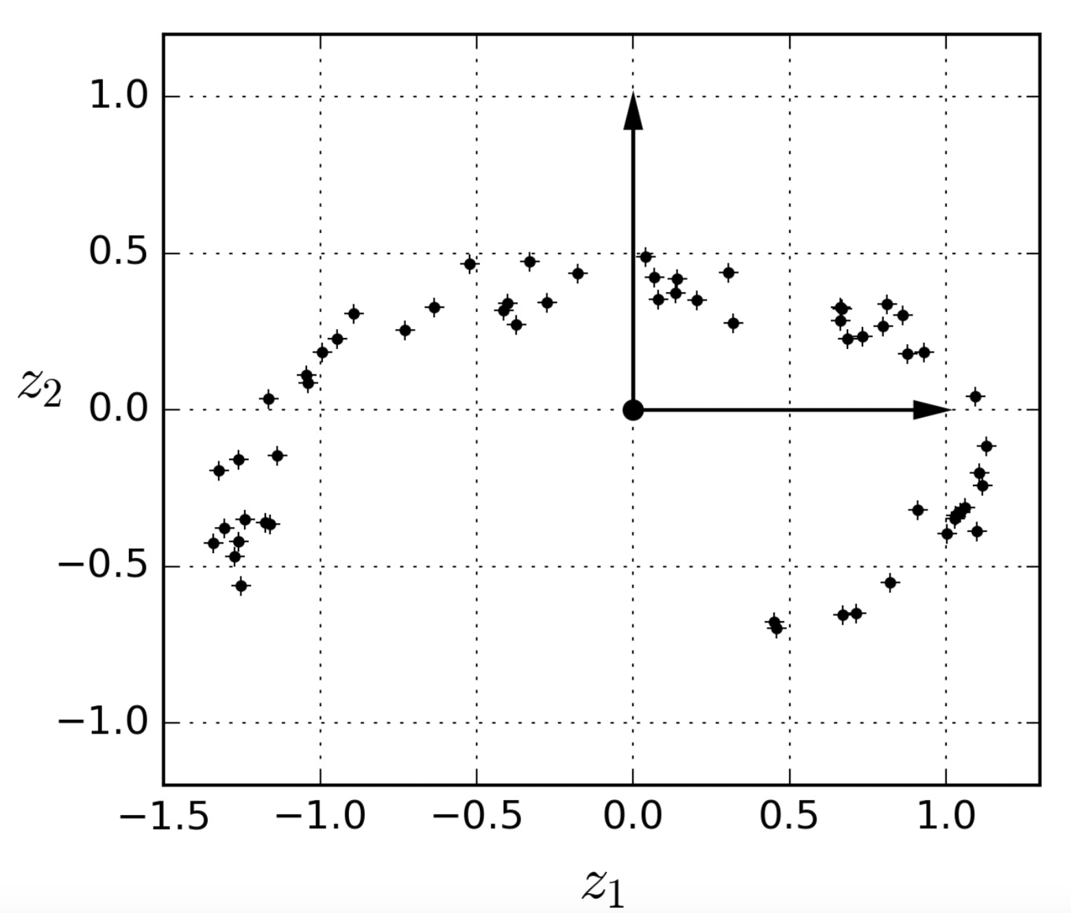 注意到所有训练实例的分布都贴近一个平面:这是高维(3D)空间的较低维(2D)子空间。现在,如果我们将每个训练实例垂直投影到这个子空间上(就像将短线连接到平面的点所表示的那样),我们就可以得到如图8-3所示的新2D数据集。铛铛铛!我们刚刚将数据集的维度从 3D 降低到了 2D。请注意,坐标轴对应于新的特征z1和z2(平面上投影的坐标)。