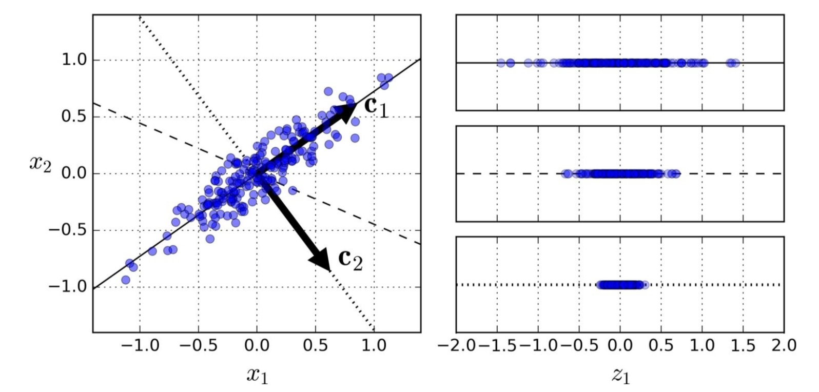在将训练集投影到较低维超平面之前,您首先需要选择正确的超平面。例如图 8-7 左侧是一个简单的二维数据集,以及三个不同的轴(即一维超平面)。图右边是将数据集投影到每个轴上的结果。正如你所看到的,投影到实线上保留了最大方差,而在点线上的投影只保留了非常小的方差,投影到虚线上保留的方差则处于上述两者之间。