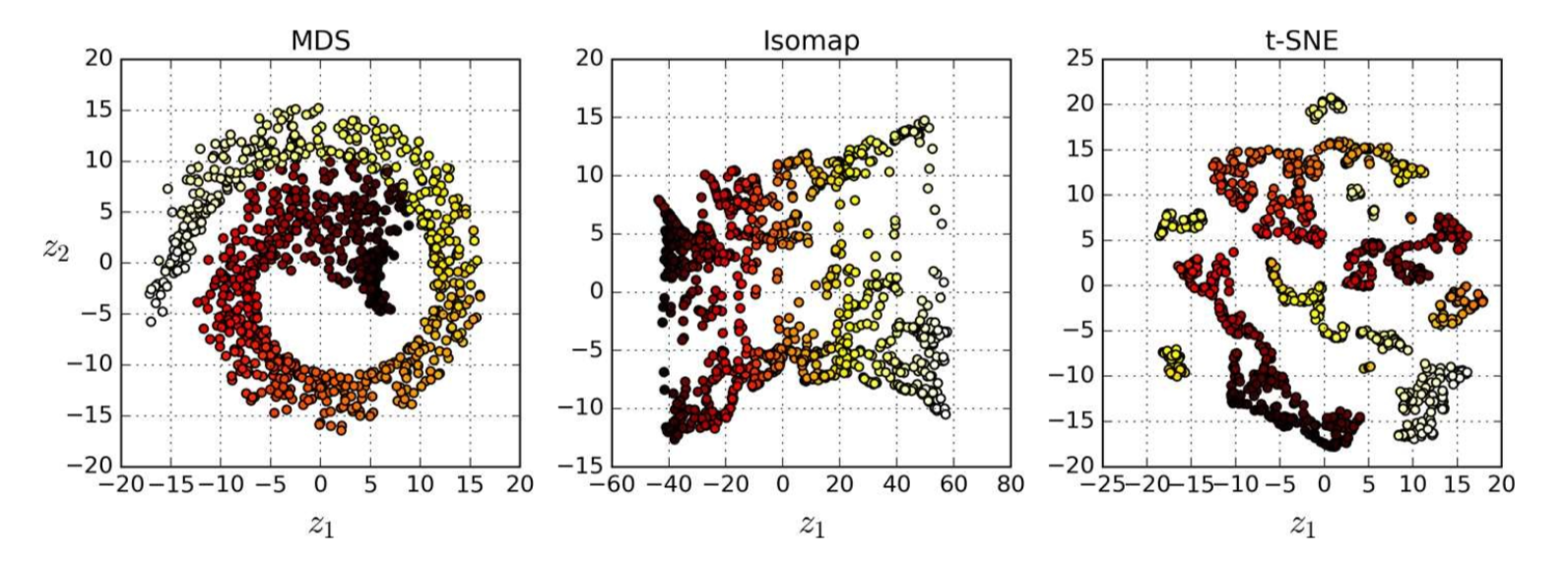 - 多维缩放(MDS)在尝试保持实例之间距离的同时降低了维度(参见图 8-13)